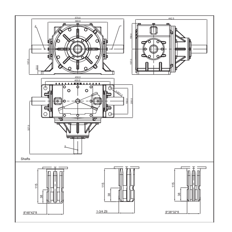 Méadaíonn an giarbhosca cumhacht trí bhosca ingearach tosaigh an mheaisín nó an tarracóra an luas rothlach, agus tarchuireann sé an chumhacht chuig an seafta cutter brúite tríd an seafta tarchuir agus an crios. Trí aschur dúbailte, is féidir le leithead oibriúcháin an mheaisín teacht ar 3.5 méadar go 6.5 méadar. Ag an am céanna, is féidir leis an bhfeidhm bhrúite thánaistigh a bhaint amach chun éifeacht bhrúite níos fearr a bhaint amach ar bharra. Brúnn an meaisín an tuí barr agus ansin athchúrsálann sé pacáistí, agus athraíonn sé é, nó cuireann sé ar ais go díreach é chuig an gcaighdeán beatha, nó cuireann sé ar ais go díreach é chuig an bpáirc chun lobhadh chun torthúlacht na talún a mhéadú. Bainfear úsáid as an gcineál seo giarbhosca i bhfeistí brúite trealaimh éagsúla amhail balers cearnóga beaga, balers cearnógacha beaga, balers cruinn, meaisíní fillte tuí, etc.